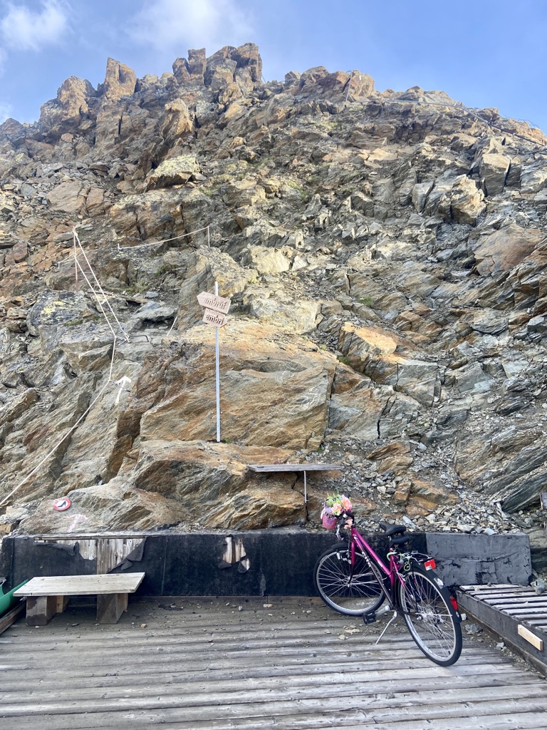 El día siguiente amaneció soleado en la cabaña, con las nubes aún encajadas en el fondo del valle, amenazando con subir. No hacía demasiado frío, así que salí a la plataforma exterior para contemplar el espectáculo. Tras un par de minutos di la vuelta para acceder al interior por el lado opuesto al se llega al refugio cuando subes. Me quedé pasmado. En la esquina había una bicicleta de paseo, apoyada sobre el pie lateral, con una maceta de flores preciosas en la cesta delantera. Sonreí al imaginar el encargo de las chicas, pidiendo al helicóptero que suministra semanalmente las provisiones que les subiera también aquella bici para adornar la terraza de un refugio a 3340 metros de altitud.